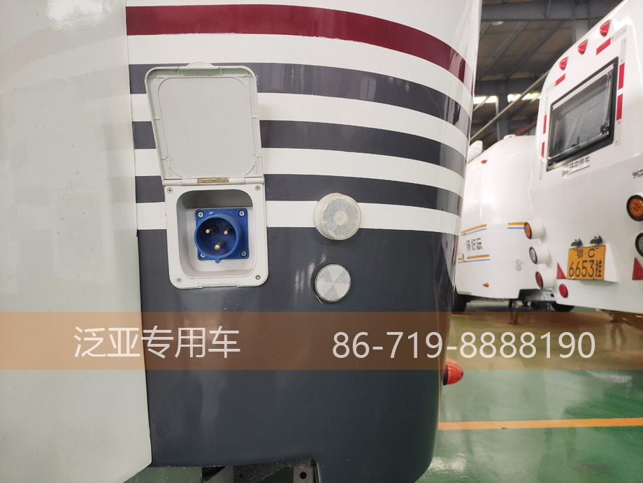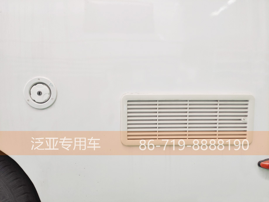 车辆后方功能齐全,转向,行车,刹车3对灯直接连通前方,行驶过程中毫无顾忌,凸起式的设计有效的减少行驶过程中灰尘的吸附,也让后面的车更加警觉,增强行车过程中的安全性。车尾的大舱门空间刚好可以容纳一台空调外机,对于选装空调的客户可谓量身定做。舱门上装有牌照架和牌照灯,不会存在看不清车牌号的情况,雾灯和放光标为安全又增加一层保障。车身左后方是我们的加水口,车内所使用的干净水全部是从这里加入,最多可以储存120L的清水。旁边的百叶窗是用来散热的,里面装的是2个12V100Ah的电瓶和1个3000W的大功率逆变器。回到车的侧面,车门是我们房车的特色之一,与车身结构统一,跟飞机舱门一样一体成型的专用车门,车门上装有一个固定窗,整体干净美观。车门上方是一个遮阳棚,,展开后最长2米,足可遮风挡雨。车顶可以选装365W的太阳能板,在日照充足的情况下每天大概能充2度,在不使用220V电的情况下还是比较受用的。