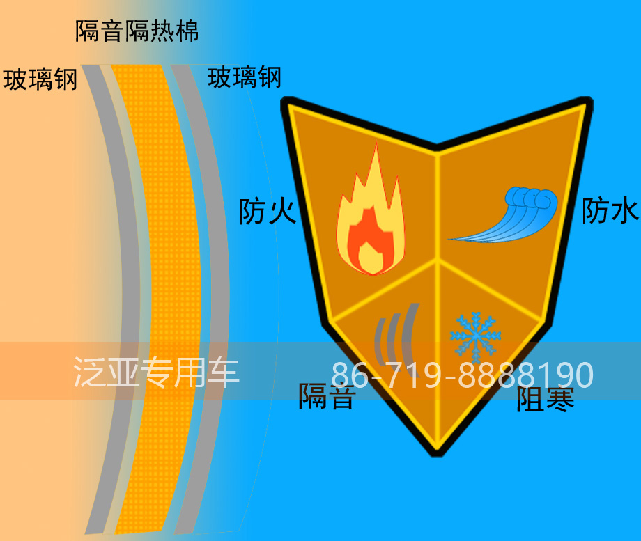 车身采用“三明治”结构,两层玻璃钢中间为保温隔热棉,保温驱寒同时防火防水。流线造型大大的减少高速行驶中的风阻。