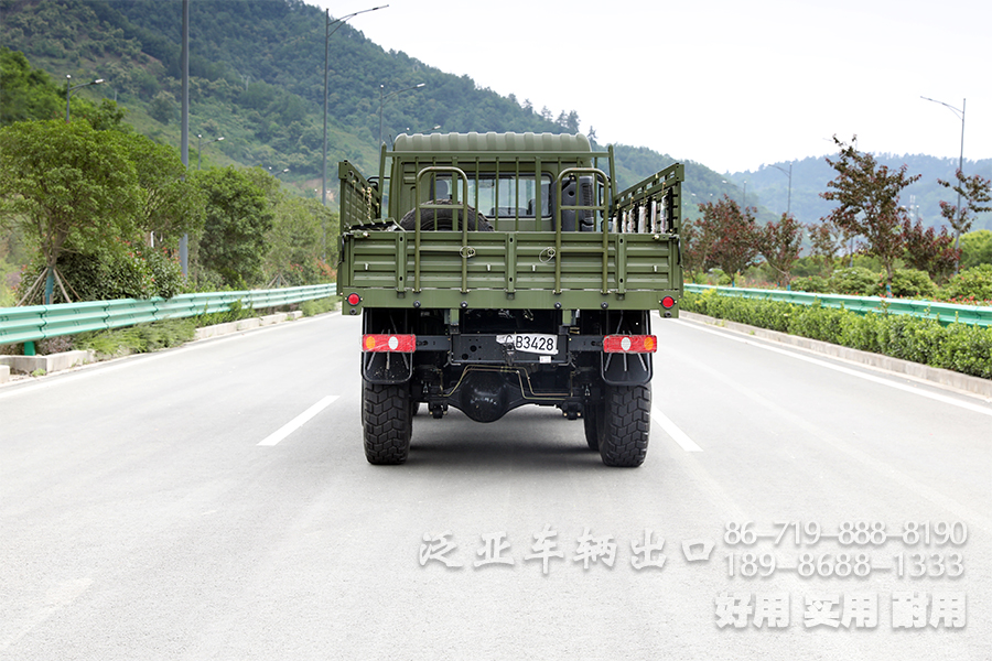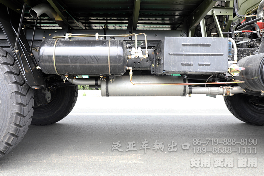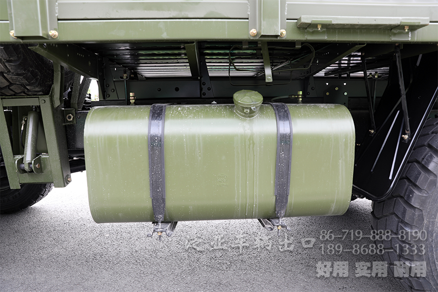 该车的驾驶室相比原来更加的豪华,两层的踏步让上车更为方便,轮胎采用12.5 R20的越野专用轮胎,一共有6条备胎,我们设计了专用的备胎架,这样的话方便备胎的装卸,油箱我们采用的是160升的全铁油箱。