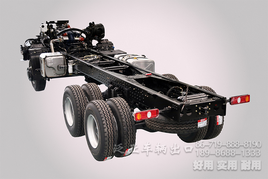 6*6东风三桥底盘,350马力,双层车架,最大可做到25吨,底盘总长8米,该底盘适合改装成自卸汽车、厢式运输车、罐式运输车等重型卡车。