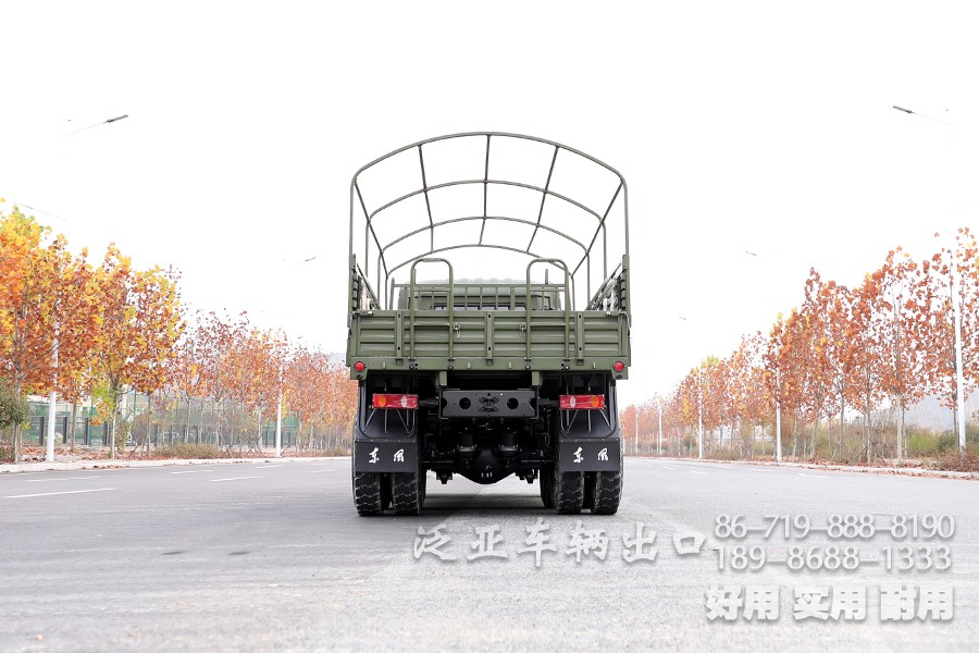 车上装有冷启动系统、副油箱、机油桶、水桶、篷布篷杆、工具箱等军用附加装置,可在-41℃环境温度下能顺利启动;可选装绞盘。