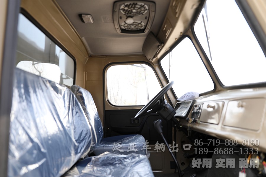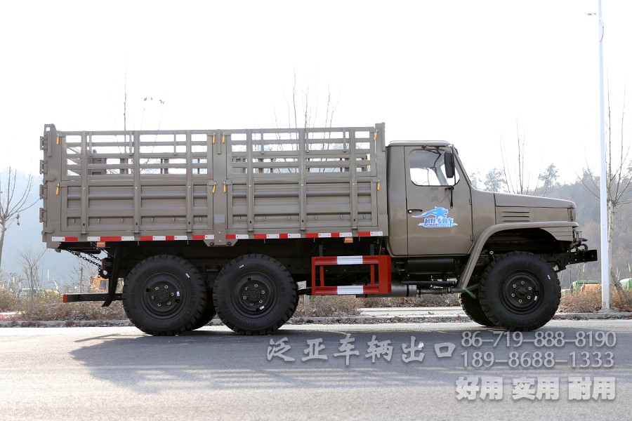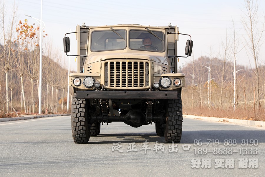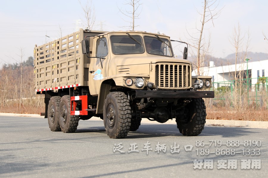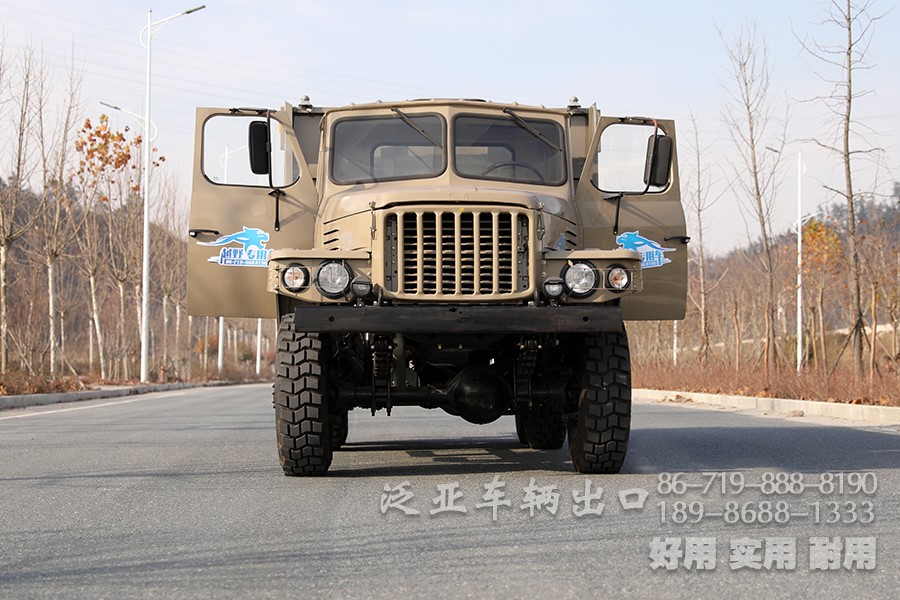 车上装有冷启动系统、副油箱、机油桶、水桶、篷布篷杆、工具箱等军用附加装置,可在-41℃环境温度下能顺利启动;可选装绞盘。