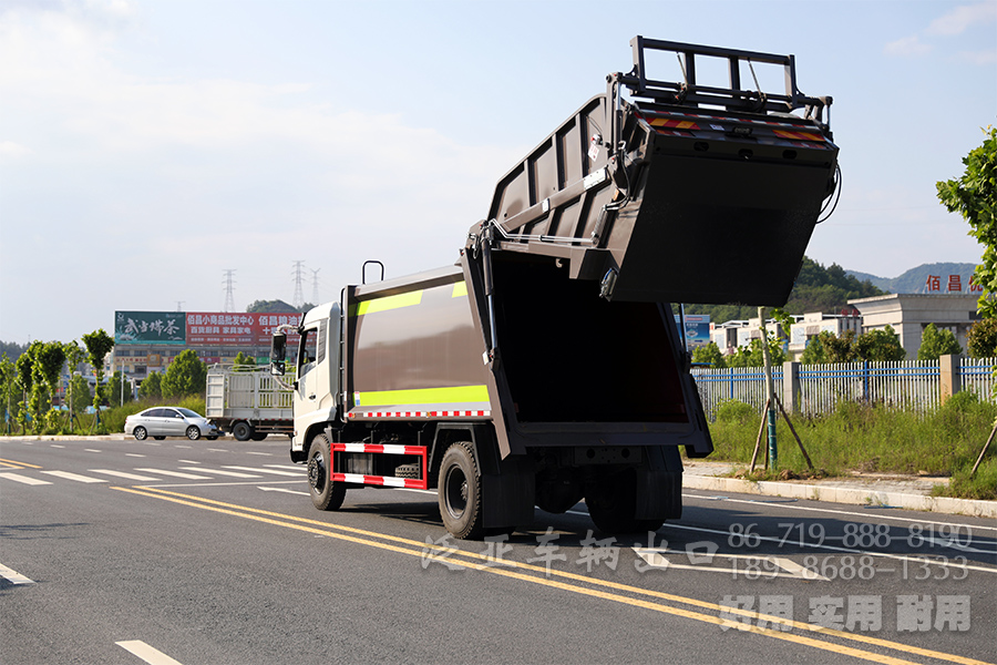 东风4*2压缩式垃圾车,箱体容积14立方米,14方压缩式垃圾仓,采用高强度钢板制作,边板4mm底板5mm,弧形箱体。填装器举升油缸带液压锁装置,采用CAN总线控制,带有自动操作和手动操作两种控制方式。车尾带翻桶装置(可同时挂2个240L国际塑料垃圾桶),更大的容积,更优秀的性能,更智能化的操作。