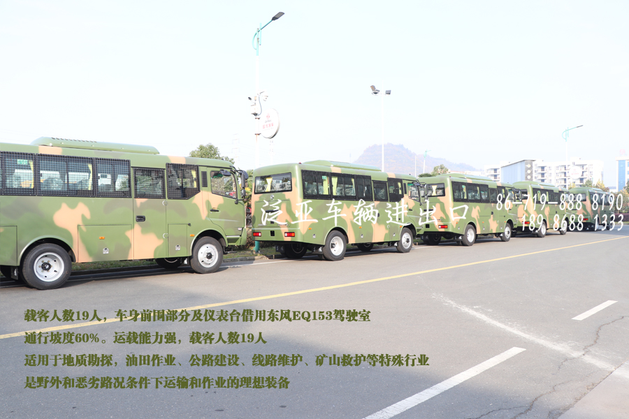 东风牌越野运兵客车不仅具有普通客车的双轮胎后桥、乘坐舒适的优点,还具备越野车的高机动性、高通过性、高运载能力等特点。车辆配备东风康明斯发动机,其整车油耗低、可靠性高、操作方便,是野外作业和特殊路况下最佳的运输装备,该车型也已列入部队运兵指定装备之一。