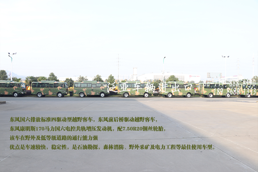 东风国六排放标准四驱动型越野客车,东风前后桥驱动越野客车,东风康明斯170马力国六电控共轨增压发动机,配7.50R20钢丝轮胎,该车在野外及低等级道路的通行能力强,优点是车速较快,稳定性,是石油勘探,森林消防、野外采矿及电力工程等 使用车型