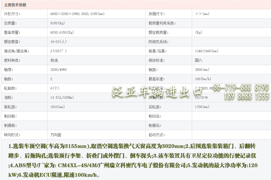 其它说明:1.选装车顶空调(车高为3155mm),取消空调选装换气天窗高度为3020mm;2.后围选装集装箱门、后翻转踏步、后拖钩孔;选装顶行李架、折叠门或外摆门、倒车探头;3.该车装置具有卫星定位功能的行驶记录仪;4.ABS型号/厂家为: CM4XL-4S/4M/广州瑞立科密汽车电子股份有限公司;5.发动机的最大净功率为:120kW;6.发动机ECU限速,限速100km/h。