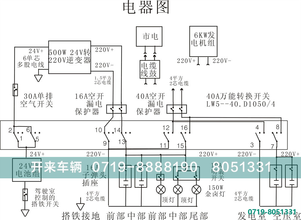 打开驾驶室的总电源开关,打开点火开关,使蓄电池旁的搭铁继电器吸合;打开右设备仓中配电柜上的配电箱中的3个开关(向搬上),配电柜上万能转换开关从停止转向逆变(向左),打开配电柜,把配电箱后的逆变器右侧的开关打开,逆变器的指示灯及风扇工作;打开箱体仓内的灯开关,3个灯都可发光;打开插座上开关,这时所有插座都有220V电,逆变器的功率只有500W,如果使用其他电器,要注意总功率≤500W;