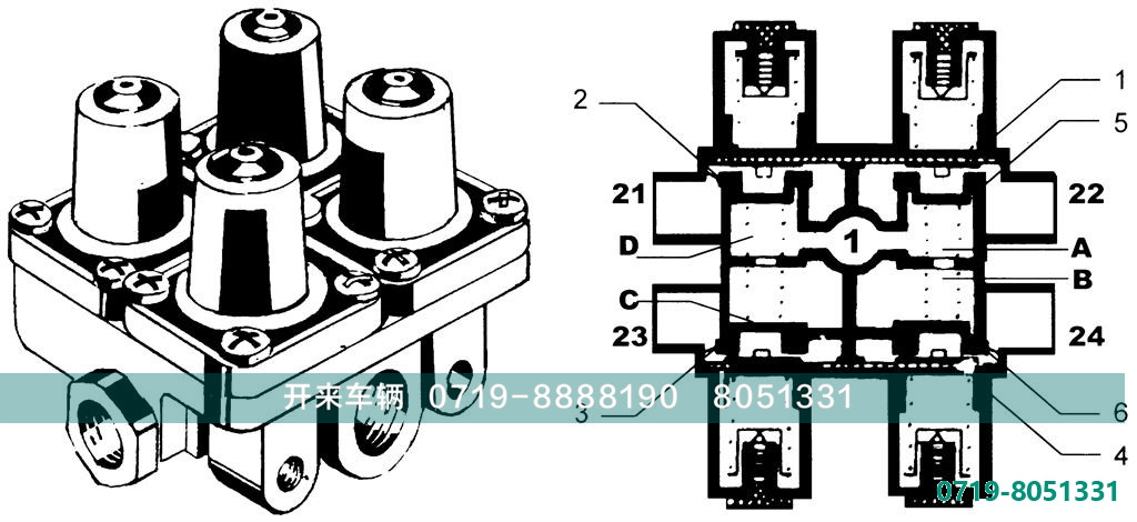 气压从1口进入同时到达ABCD四腔。当达到阀门的开启压力时阀门2356同时被打开,压缩空气经21,22,23,24口输送到贮气筒。当某一回路例如21失效时,由阀门3,5,6的单向作用,保证22,23,24回路的气压不卸漏,同时22,23,24口的气压作用在膜片上4上和膜片1的右半部分,使得1口的气压容易将阀门3,5,6打开继续向22,23,24回路供气。当充气压力达到或超过阀门2的开启压力时,气压才从损坏的回路21中泄漏,而尚未失效的其它回路的压力仍能得到保证。