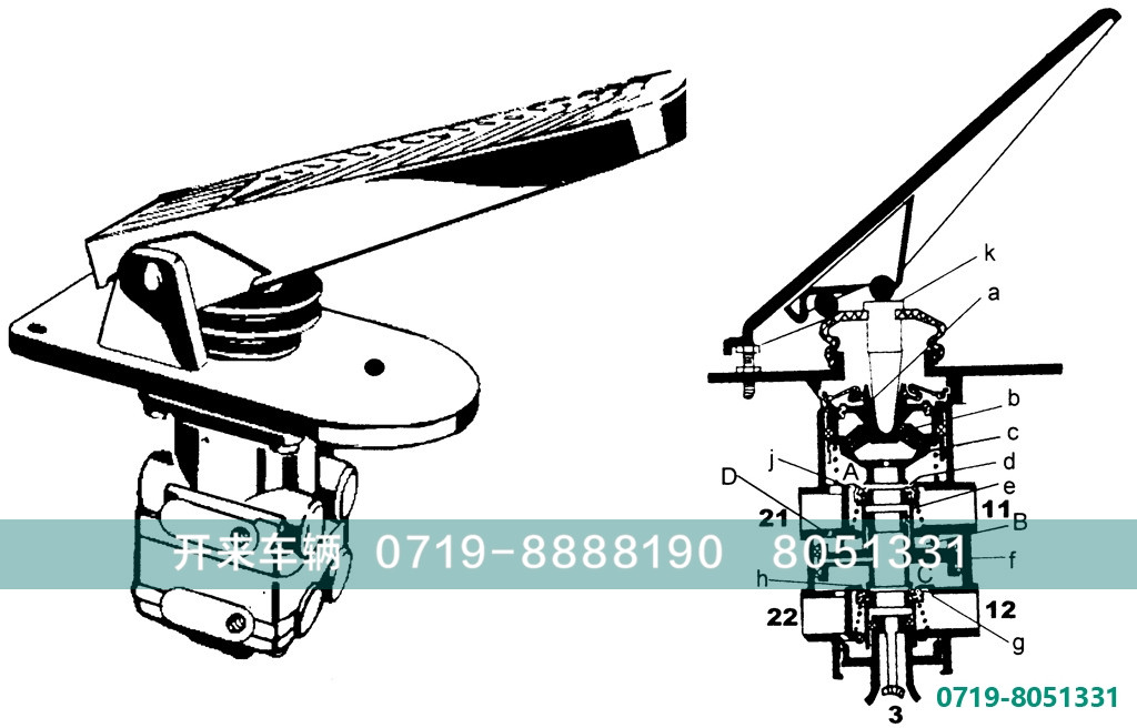在顶杆座a施加制动力,推动活塞c下移,关闭排气口d,打开进气门j,从11口来的压缩空气到达A腔,随后从21口输出到制动管路I。同时气流经孔D到B腔,作用在活塞f上,使活塞f 下行,关闭排气孔h,打开进气门g,由12口来的压缩空气到达c腔,从22口输出送到制动管路II。