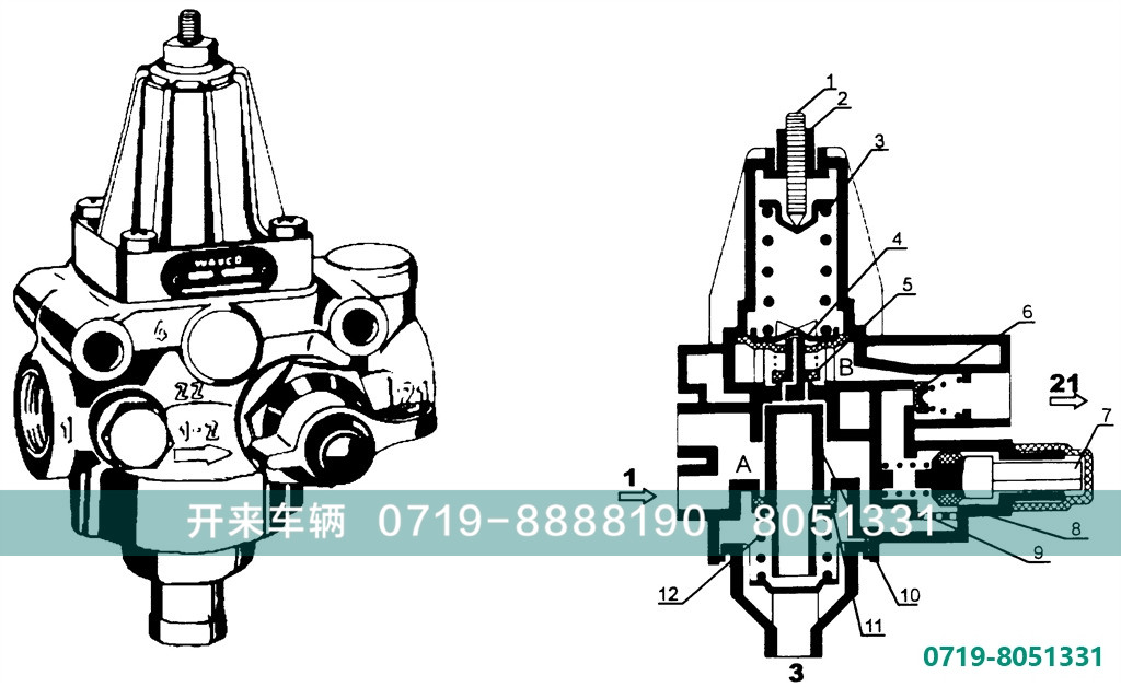 由于空压机输出的压缩空气从1口进入A腔经由滤清器(9),单向阀门(6)从21口输入,同时一部分压缩空气到达B腔。当B腔压力达到810+-20Kpa时,膜片总成(4)克服弹簧(3)的预压力而上移,阀门(5)打开,气压推动活塞(10)下移,打开排气门(11),气流经排气门(11)从3口排出,空压机卸载。当21口的压力下降了60+70Kpa时,由于B腔压力下降,膜片总成(4)下移,将阀门(5)关闭,活塞(10)上移将排气门(11)关闭,空压机恢复向系统供气。当系统压力过载时,调压阀内部的集成安全阀门(11)打开,从而实现过载保护。