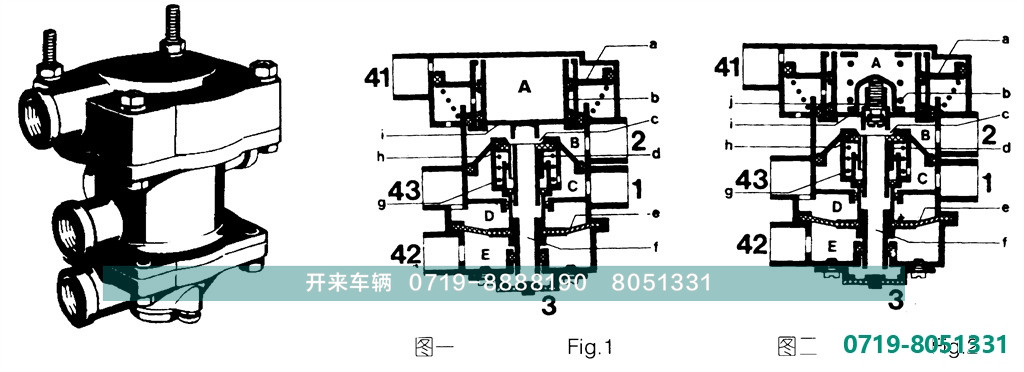 当操纵牵引车行车制动时,从制动阀第一回路来的压缩空气从41口进入A腔,作用在活塞A上,使排气门C关闭,进气门h开启,2口则有输出。2口输出气压值的大小与41口气压值成正比例。当第一回路失效时,41口无气压出入,此时从制动阀第二回路来的压缩空气从42口进入。E腔,作用在膜片e上,使排气门C关闭,进气门h开启,2口有输出。2口输出气压值大小与42口气压值成正比例。当解除制动时,41、42口气压下降而43口气压上升、进气门h关闭,排气门C打开,B腔气压(2口气压)从排气口3进入大气。
